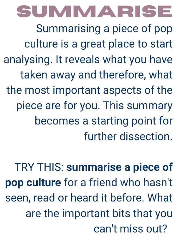 SO to help out we have created this guide with some tips for analysing popular culture and using popular culture to understand what rape culture is and how it manifests itself in the world around us. You might recognise this blog post all about I May Destroy You? Well, here it has been annotated to help signpost some useful analytical frameworks and tools. Anything in bold and italics has a note next to it… please explore and share and let us know what you think!